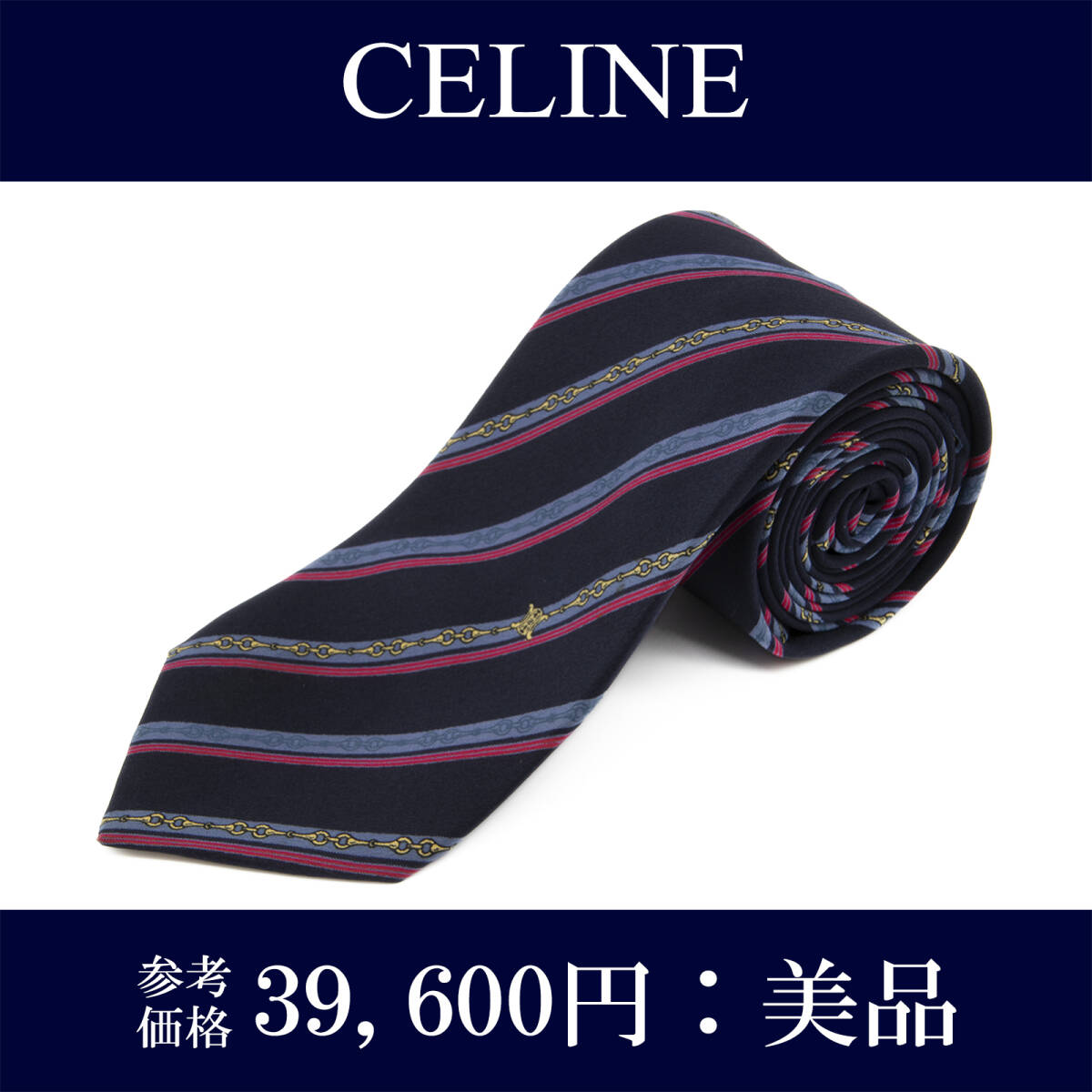 - 送料無料 セリーヌ ネクタイ シルク ネイビーブルー 青 赤 ビジネス ブランド マカダム ストライプ ホースビット ロゴ マーク 綺麗 N068
