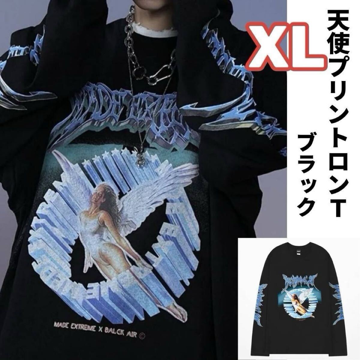 - オーバーサイズ ロンT 天使プリント ブラック XL 韓国 ストリート