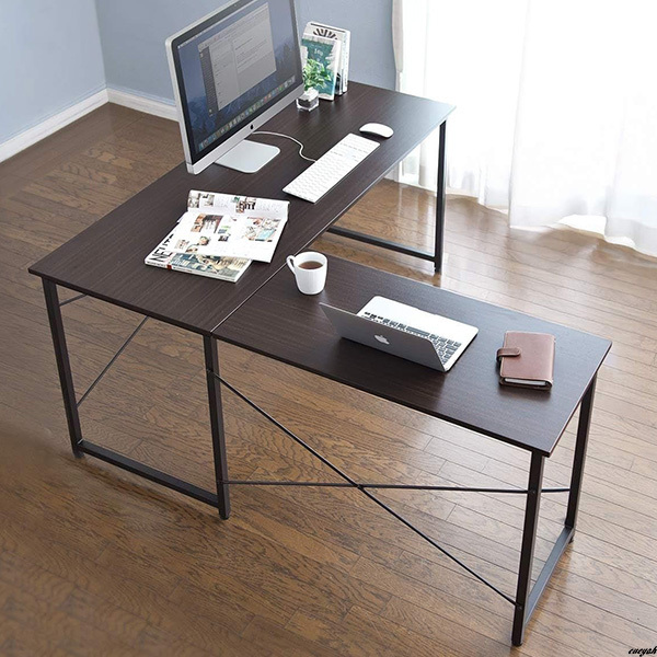 - 【補強パイプとクロスバックフレームで、安定した強度と耐久性】 パソコンデスク L字型 木製 コーナーデスク ダークブラウン