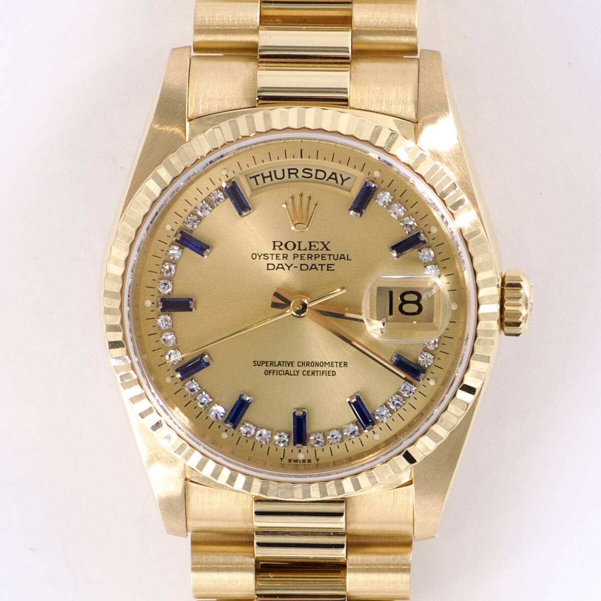 > 純正ロレックス レアモデル DAY-DATE Ref.18238LS 36MM L番 10Pバケットサファイヤ文字盤 メーカーメンテ済み メーカー保証書付
