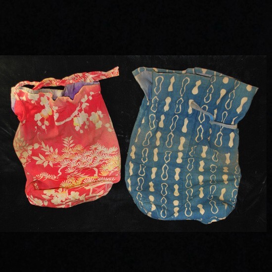 > ●1799● 細工物に ◆ 古布袋 ( 三味線入れ ) 瓢箪柄藍染布+松竹梅他花柄縮緬布 ◆ 厚手で希少な柄の藍染古布!
