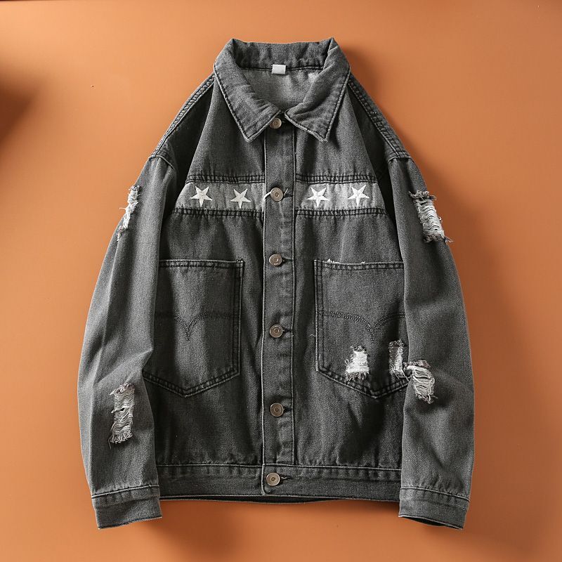 - 人気推薦/【春の新作】ヴィンテージデニムジャケット スター刺繍 ダメージ加工 メンズ リーバイス風 5サイズ/ グレー