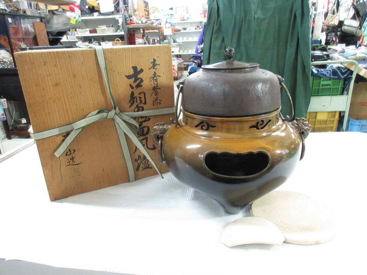 - 芳山造 古銅鬼面風炉釜 共箱 茶道具 茶釜 風炉 現状