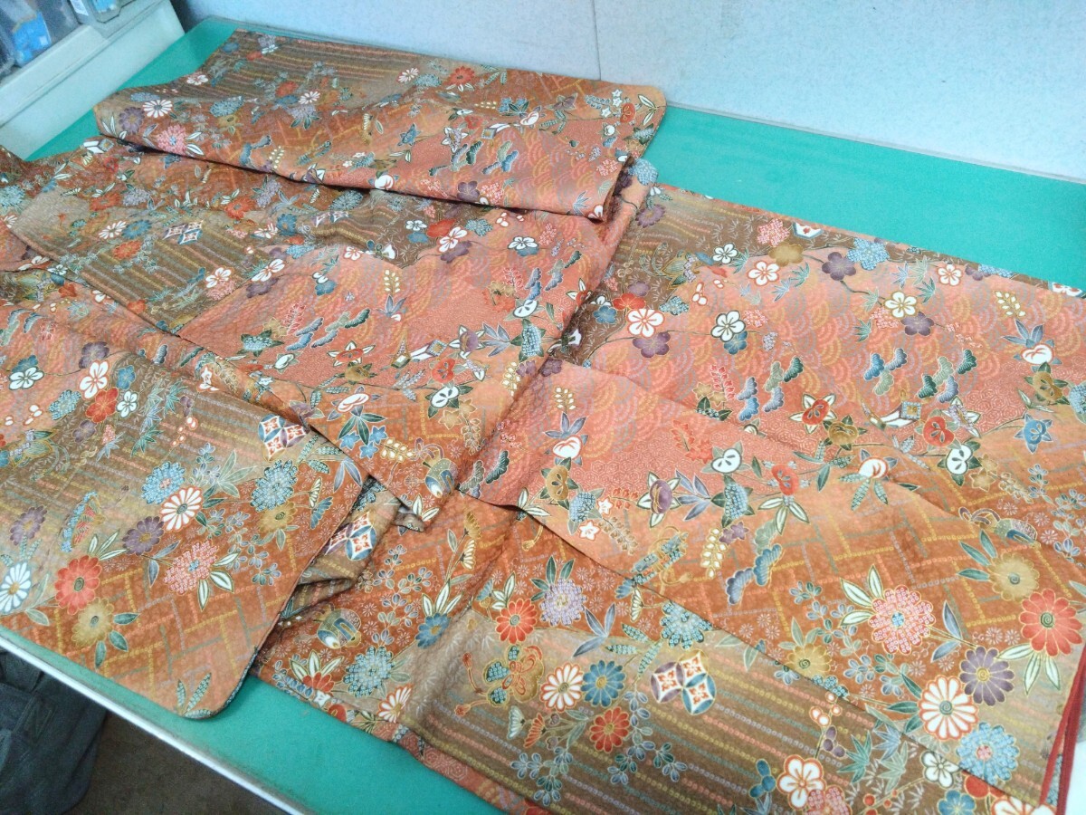 > ●4 高級 縮緬 ちりめん 正絹 着物 華やか柄 橘 桜 松 竹 梅 桔梗 金彩 銀彩 くすみカラー 華やか 小紋 未使用品? 美品 ③
