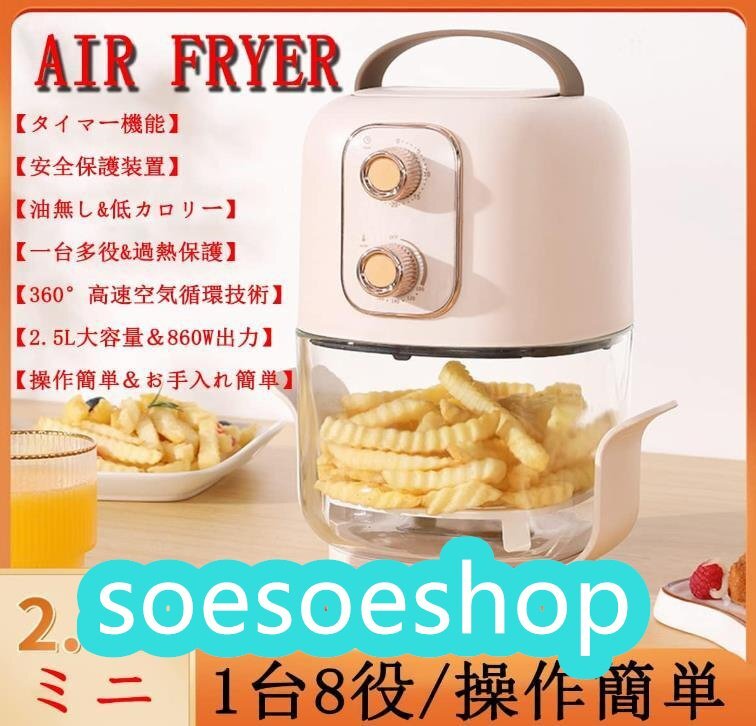 - 大好評☆ミニ電気フライヤー 2.5L容量 680W 見える 1台8役 ノンオイル 揚げ物 1~2人 自動電源オフ 過熱保護 エアーフライヤー