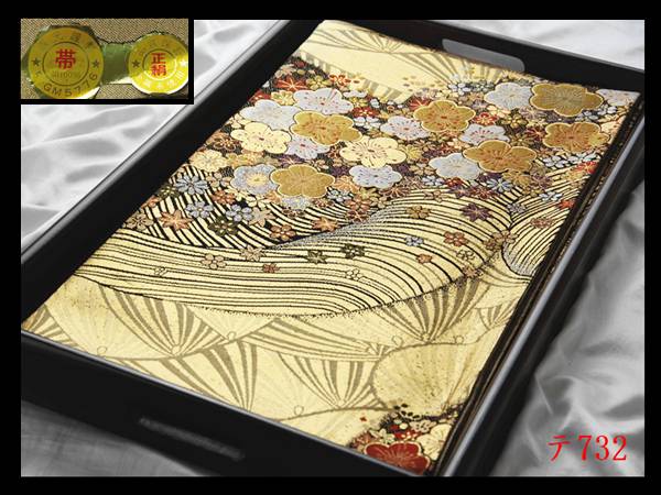 - 蔵【テ732】西陣逸品 振袖可 波に桜散らし紋 華やぎの品格 正絹純金糸六通高級美術袋帯 未使用 ◇検◇簪着物名古屋帯和装小物帯締め