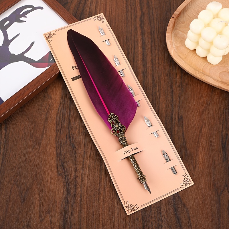 - 万年筆 おしゃれ フェザー 羽根 高級感 ローズレッド 赤 金属 ペン先5点セット アンティーク風 プレゼント ギフト かっこいい t5117