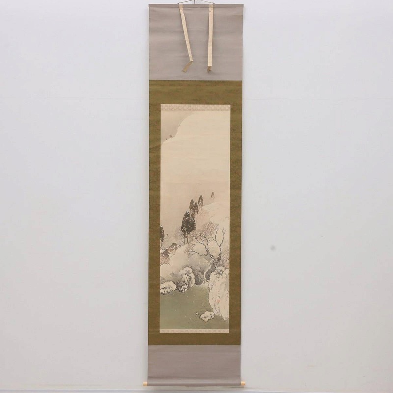 - 【真作】川北霞峰 掛軸 絹本 肉筆 彩色「山村積雪」落款 印有 共箱 日本画 師・菊池芳文 帝展審査員 cd04-9719[TOM]
