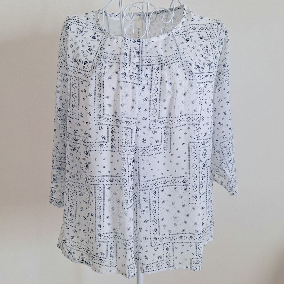 - ◆未使用◆白×ネイビー◆シフォン◆柄模様◆ブラウス◆八分袖◆L◆