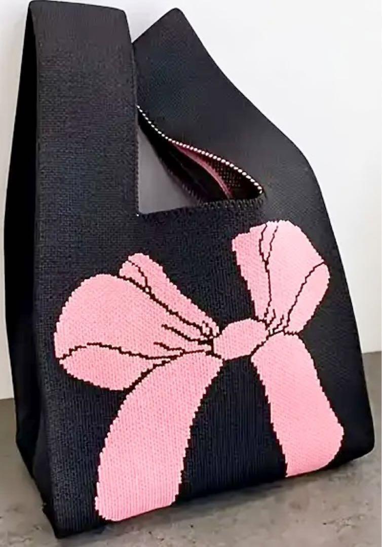 - ニット 両面リボン トートバッグ 黒地×ピンクリボン/送185〜