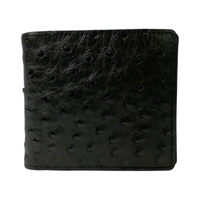 - 【美品】財布 二つ折り財布 折財布 コンパクトウォレット ミニ財布 オーストリッチレザー ブラック 黒