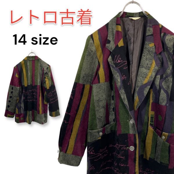> 【昭和レトロ】レディース テーラードジャケット サイズ14 アート柄 総柄 グリーン系 裏地 ビンテージ 日本製 匿名配送
