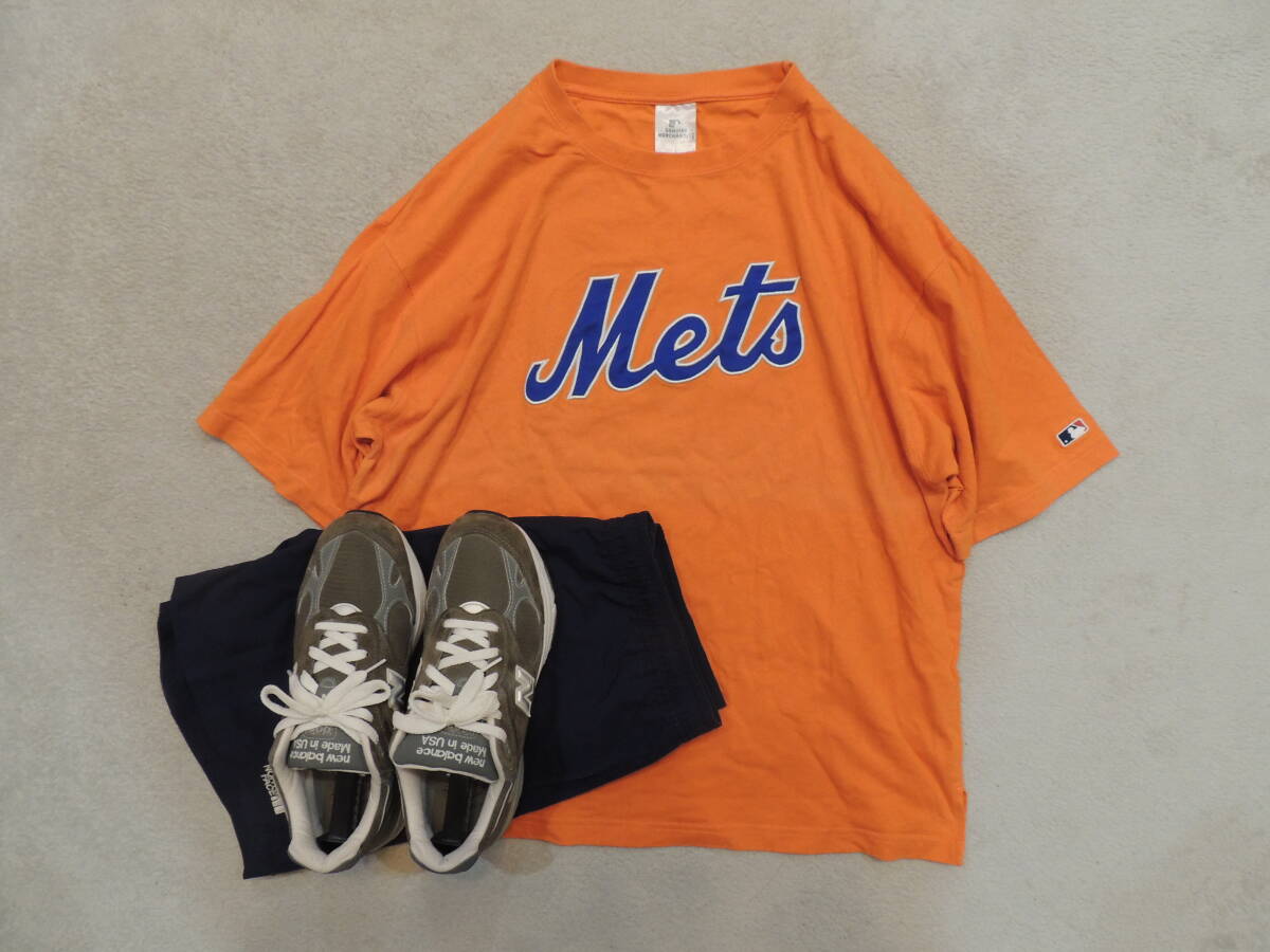 > Mets メッツ メジャーリーグ 前後腕ロゴ クルーネック 半袖Tシャツ オレンジ メンズL