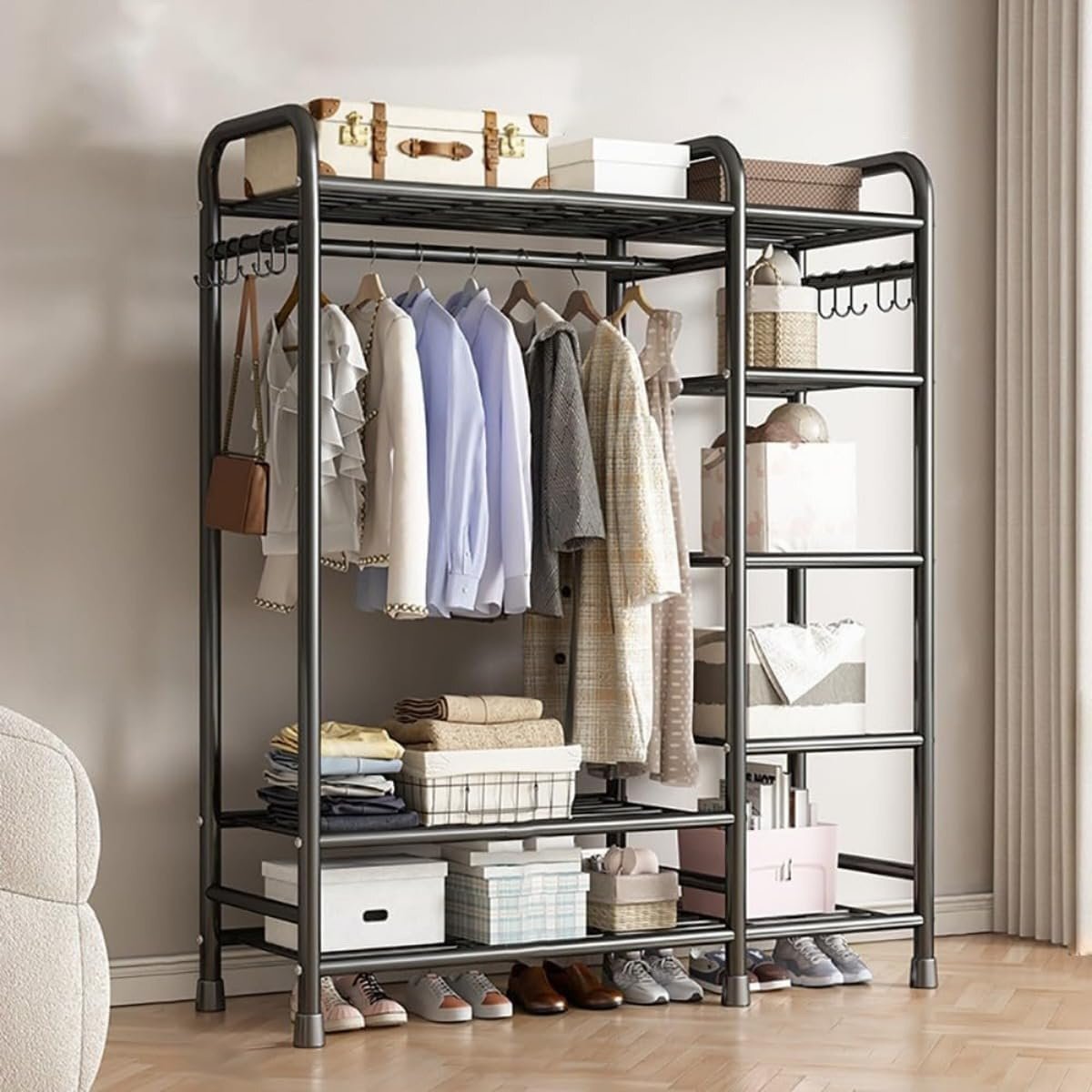 > ハンガーラック 頑丈 耐荷重380KG 洋服ラック 大容量 メタルラック スチールラック 棚 ワードローブ 衣類ラック 収納付き (黒ですA)