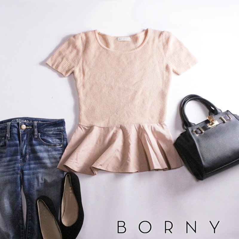 - 美品 春ニット BORNY ボルニー きれい色 やさしい ピンク 可愛い 裾フリル 半袖 ペプラム ニットカットソー F ペプラムニット サイドZIP