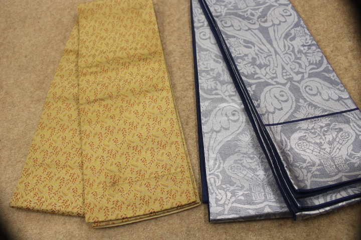 - きもの今昔8303 半巾帯 2本セット ①正絹ベージュ色蓮華の花柄 ②西陣織正絹銀引き箔名古屋帯