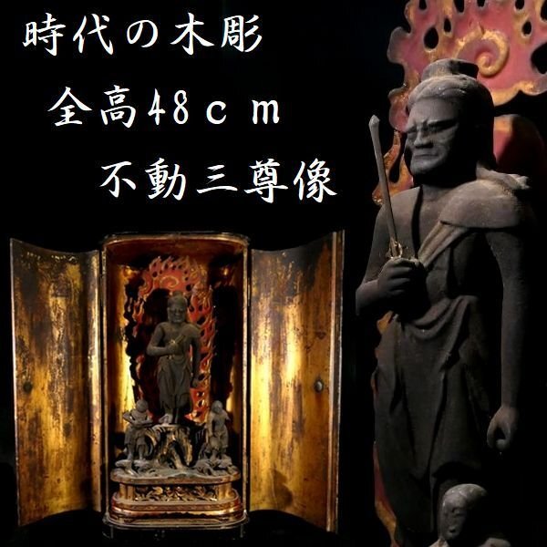 > 【 恵 #1571 】 時代を経た味のある木肌をした迫力の不動三尊像 全高 約 48cm 不動明王立像 制多迦童子 矜羯羅童子 厨子入