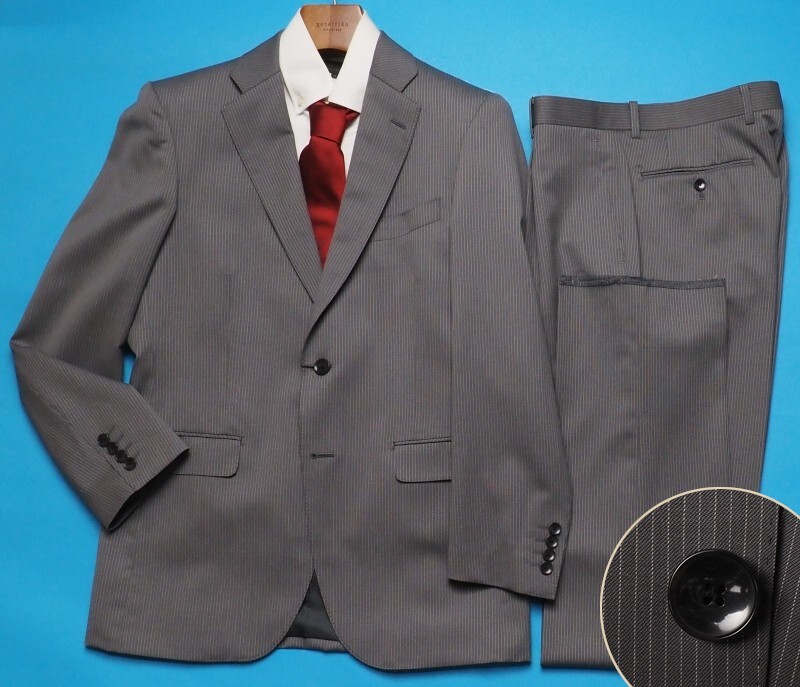 - 新品 大手百貨店扱い 日本製 市松柄裏地 ウール混 ギャバジン ストライプ スーツA5灰(H) 1213261