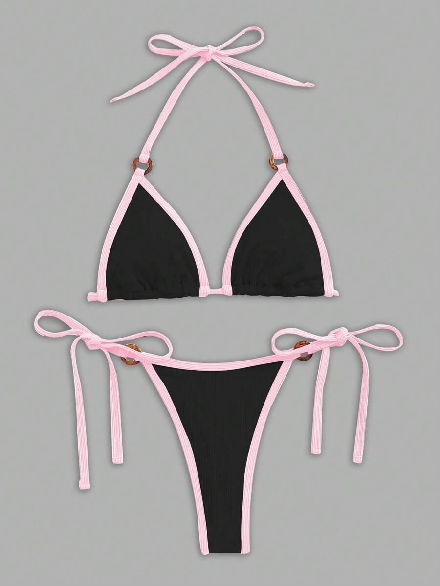 - レディース 水着 ビキニセット レディース コントラストカラー トリム ホルターネック バックレス 紐 ビキニトップ&ボトム 2点