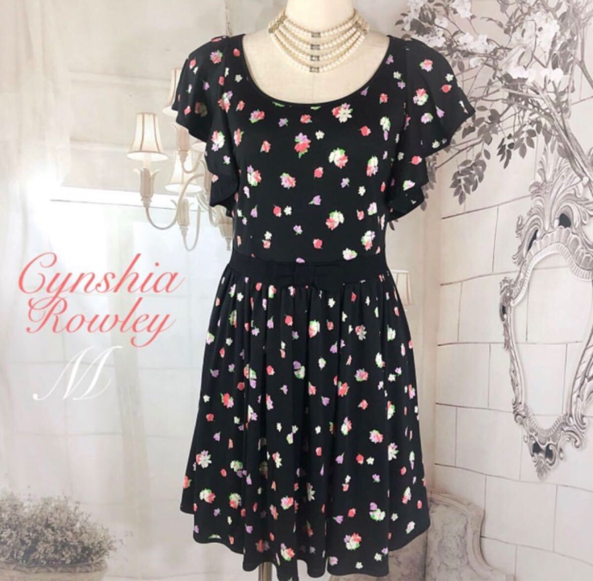 - Cynshia Rowley ブラックフリルブーケマルチ ミニワンピース 単品 M 半袖