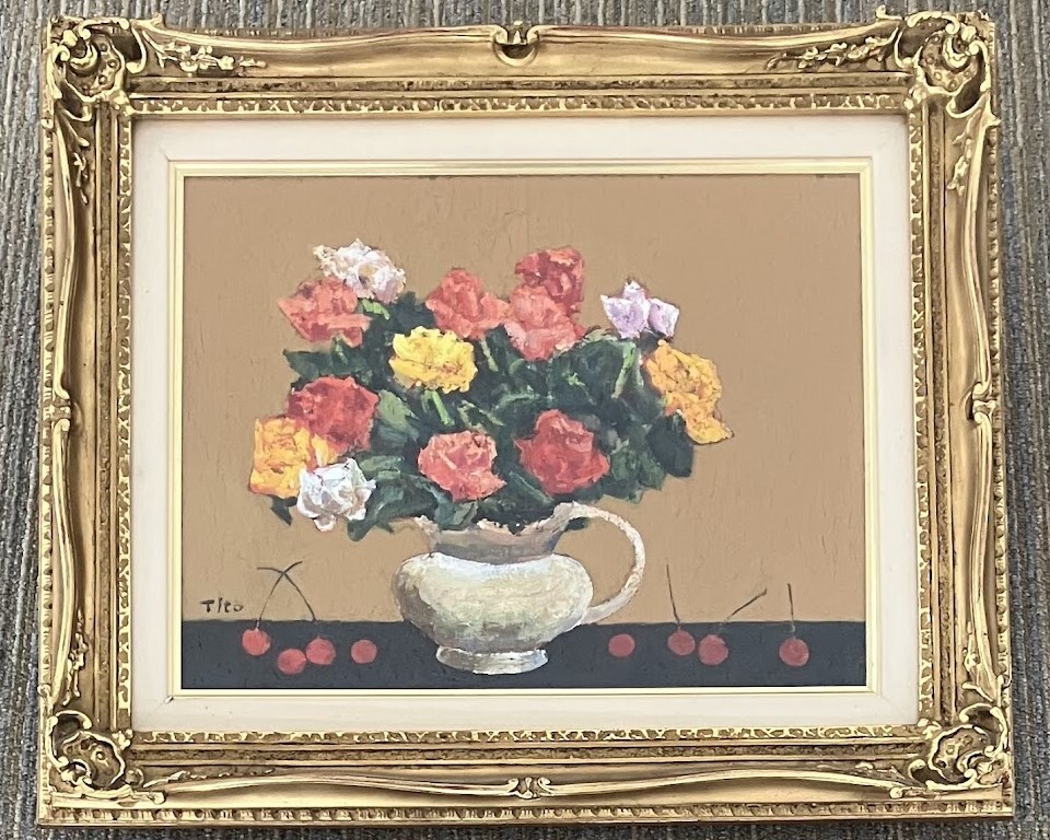 - [真作保証] 伊藤継郎 サクランボとバラ 油彩画 白鳳梅田画廊取扱シール 昭和59年 名品 大阪芸大 京美大教授 厚盛油彩画 物故巨匠 R7-0055