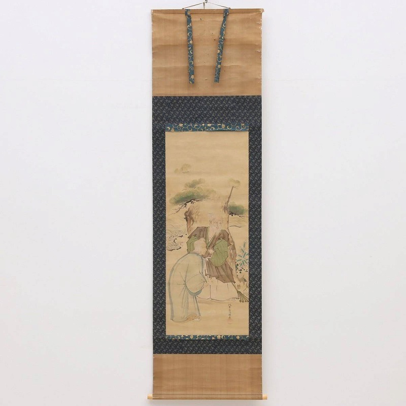 - 【真作】英一蝶 掛軸 絹本 肉筆 彩色「高砂図」落款 印有 合箱 風俗画家 芸人 狩野派風町絵師 江戸時代 cd13-9769[OTO]