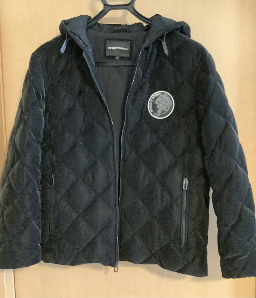 - 【送料込】EMPORIO ARMANI エンポリオ アルマーニ ダイヤモンドキルト ダブルジップ ダウンジャケット M 黒 光沢 中綿 タイガープリント