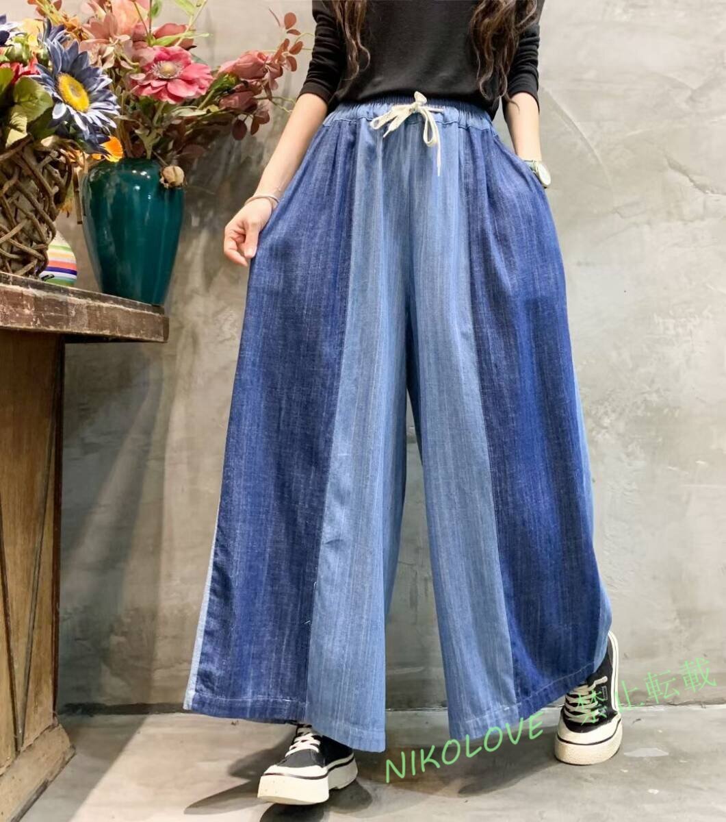 - ☆新品 デニム ガウチョパンツ 大人可愛 ゆったり オシャレ フリーサイズ ナチュラル 綿コットン 縫い合わせ MK539