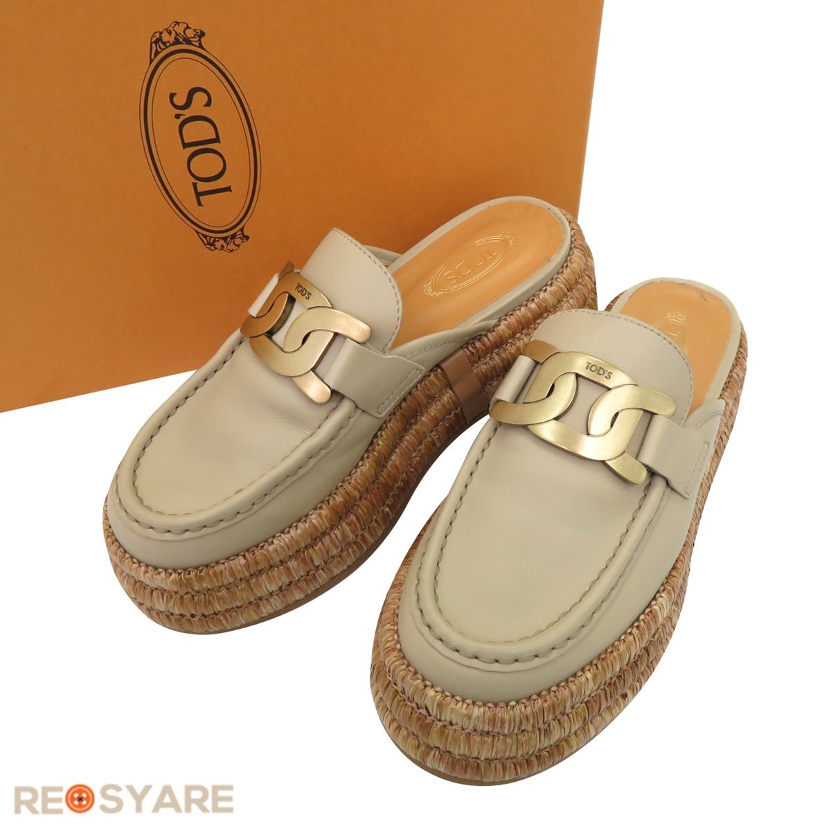 > 美品 TOD'S トッズ KATE ケイト ロゴ メタルチェーン レザー ラフィア プラットフォーム サボ ミュール サンダル 箱付き 47251