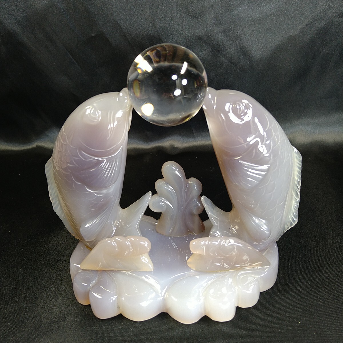 - 甲州水晶貴石細工 伝統工芸士高野誠 作品 鯉 瑪瑙 天然白水晶 置物 ブラジル産天然白水晶