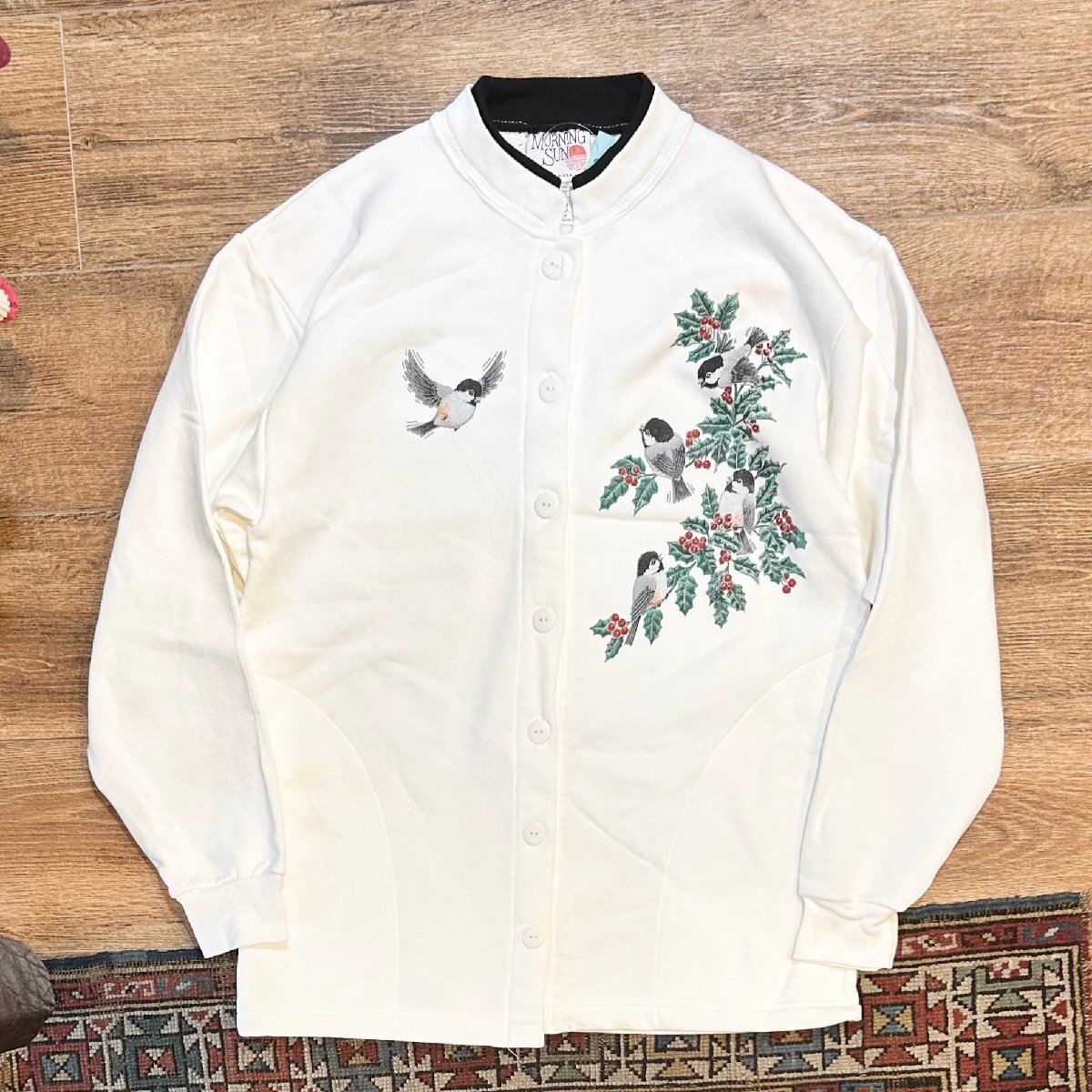 - デッドストック 90's MORNING SUN 小鳥 白x黒 襟二重リブ ヒイラギ 文鳥【スウェットカーディガン】レディース古着 W-M EB2461-10-80-EB27