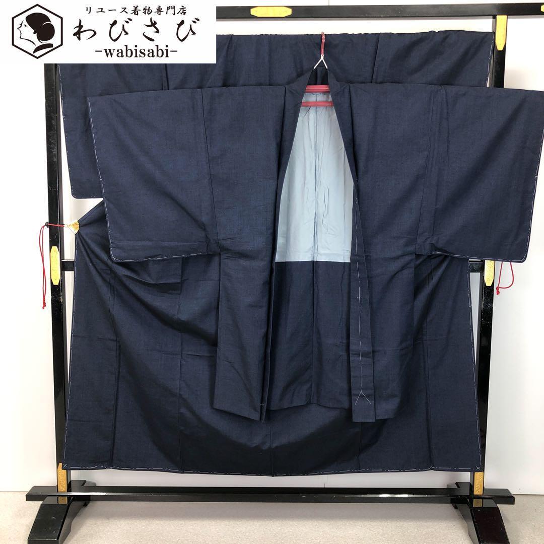 - 男着物 アンサンブル 紬 濃藍色 キングサイズ しつけ糸 M-1104 着物 きもの kimono 和服 和装 中古 リサイクル着物 【送料無料】