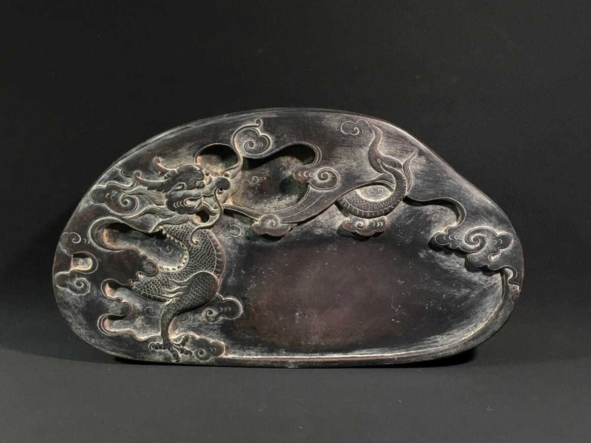 - 古びた蔵『清代 玉帯石彫り 飛龍乘雲文房端渓硯 南阜(高鳳瀚)銘』極細工 文房具 書道具 古賞物 古美術 中国古玩
