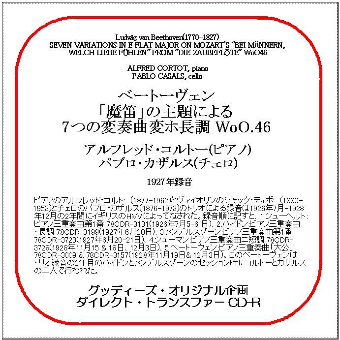 - ベートーヴェン:「魔笛」の主題による7つの変奏曲/コルトー、カザルス/ダイレクト・トランスファー CD-R