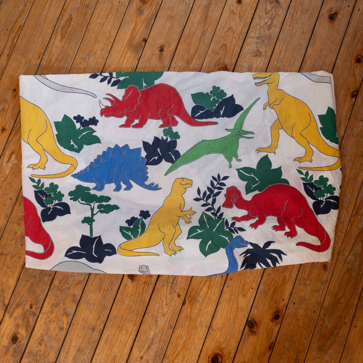 > USAヴィンテージ ベッドシーツ 恐竜柄 リメイク生地 素材 USA製 カラフル 総柄 ダイナソー ボックスシーツ アメリカ仕入 B2373