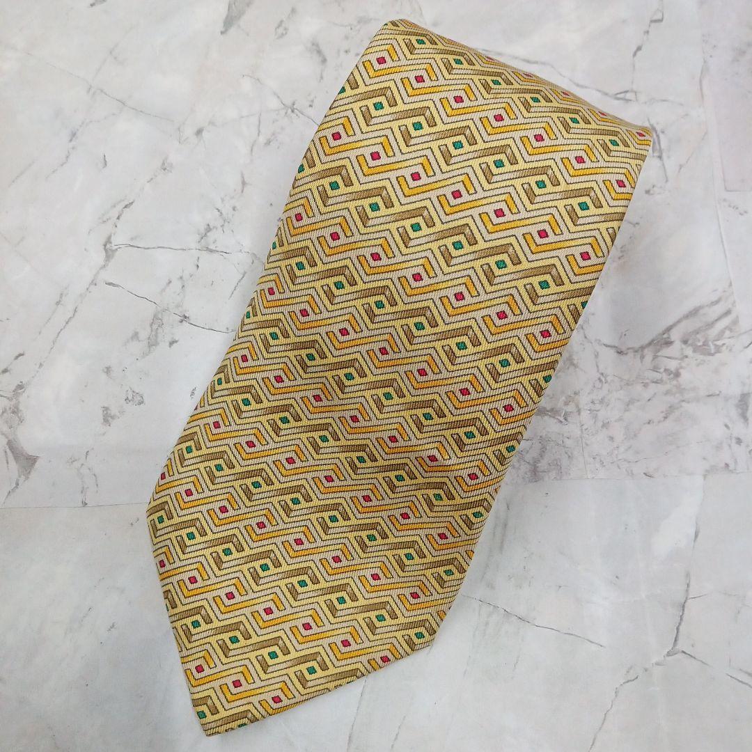 - エルメス ネクタイ 黄色 幾何学柄 シルク100% 絹 高級感【n937】