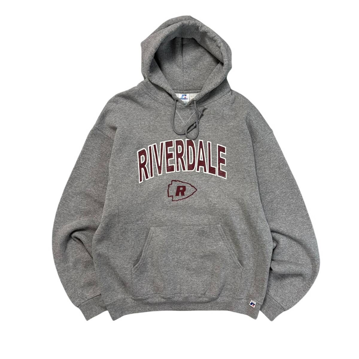 - L 古着 Russell Athletic ラッセルアスレチック ラッセル パーカー プルオーバー リバースウィーブ型 前V ガゼット カレッジロゴ グレー