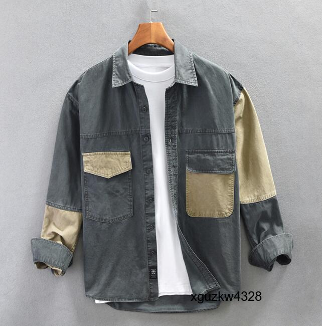 - ワークシャツ メンズシャツ 無地 切替 胸ポケット ミリタリーシャツ 長袖シャツ ジャケット コットン 春秋 カジュアル オリーブ 2色 M~4XL