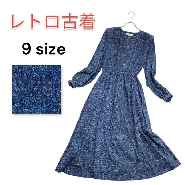 - 【レア】昭和レトロ ワンピース サイケ 総柄 青系 ベルト付 ゆったり エレガント 裏地付