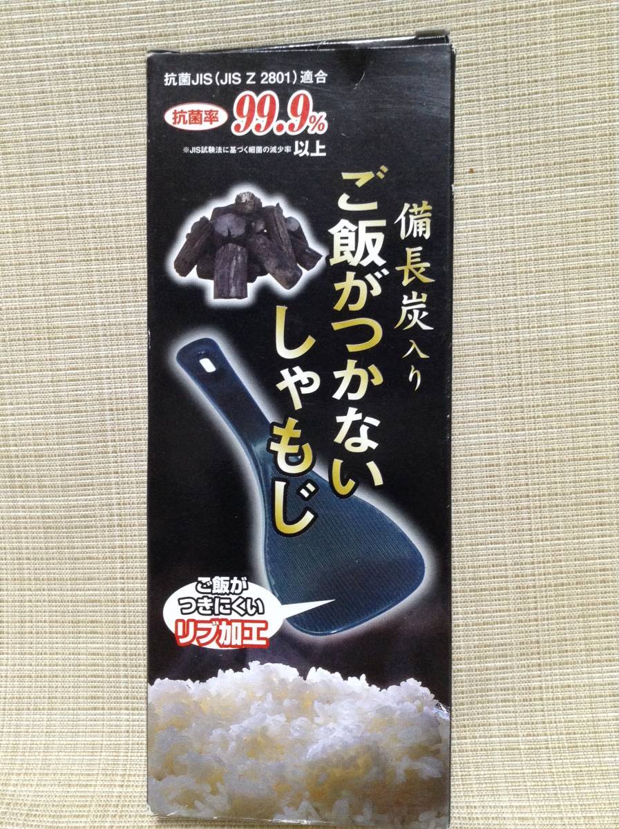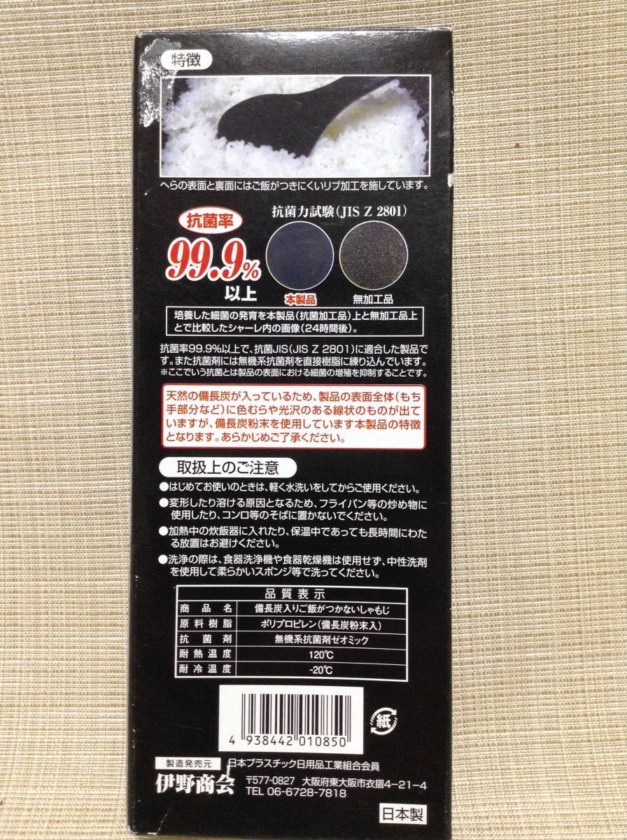 備長炭入り ご飯がつかないしゃもじ 日本製 抗菌JIS(JIS Z 2801)適合 抗菌率99.9% リブ加工 伊野商会