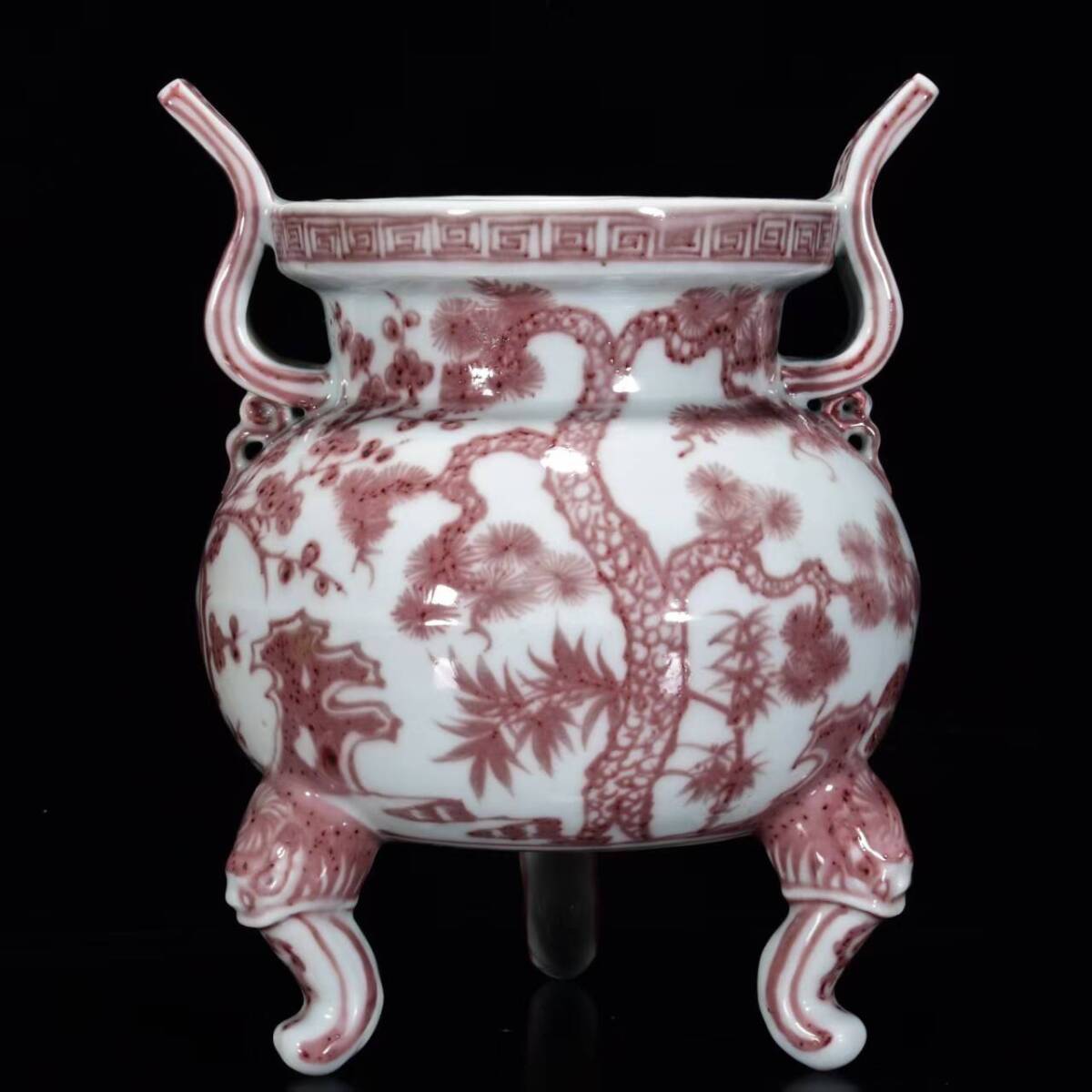 - 『館蔵珍品 元 古陶瓷品 釉里紅 松竹梅紋 三足熏香炉』置物 賞物 貴重物品 収蔵品 中国古美術