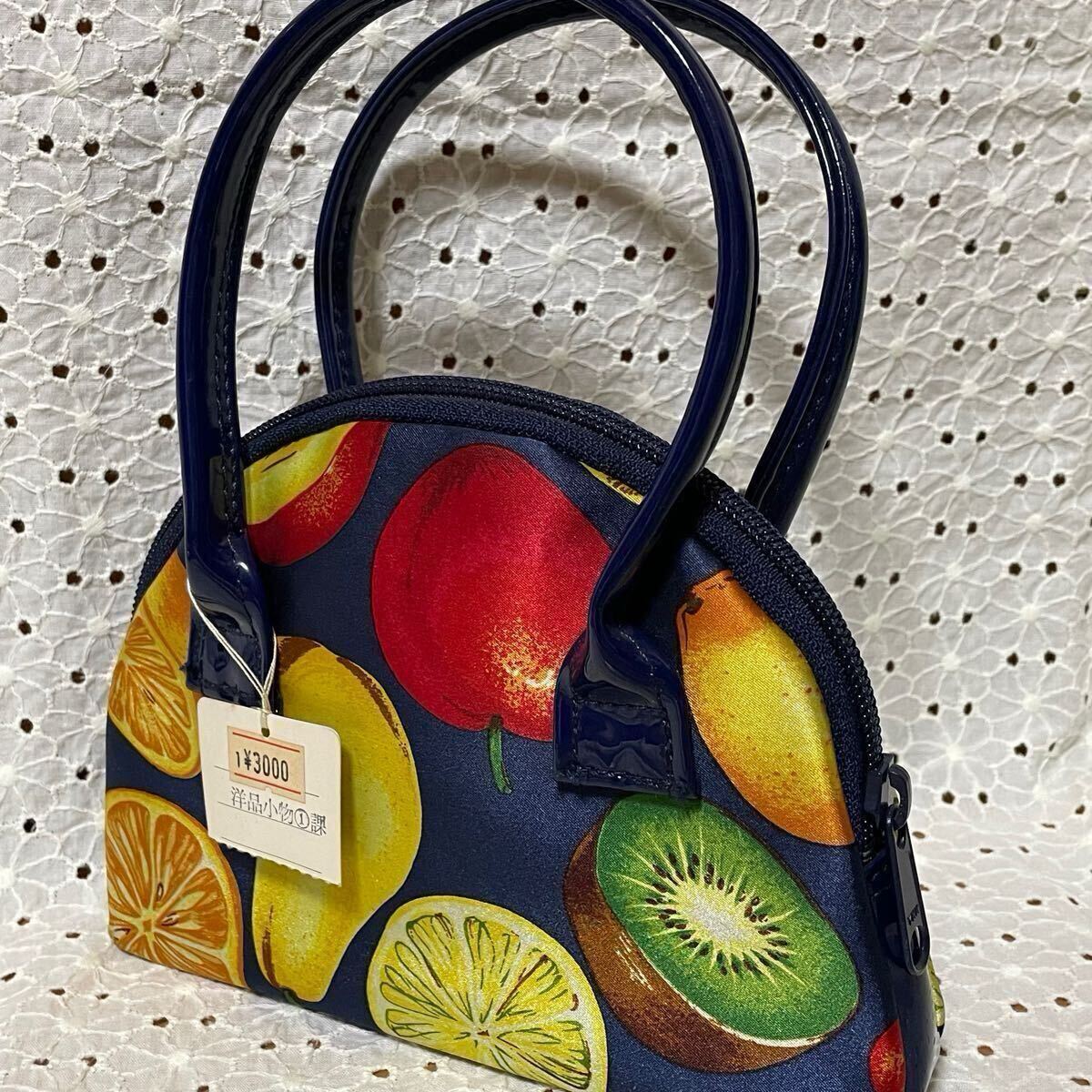 - 昭和〜平成レトロ フルーツ柄 ボストンバッグ型ミニバッグ ハンドバッグ ミニカバン ビニール×エナメル 紺色×カラフル レトロポップ 雑貨