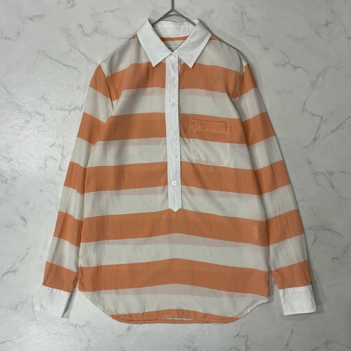 > EQUIPMENT エキプモン 異素材 ボーダー ポケット ボタン シャツカラー ラウンドカット シルク 長袖 シャツ ブラウス ホワイト XS