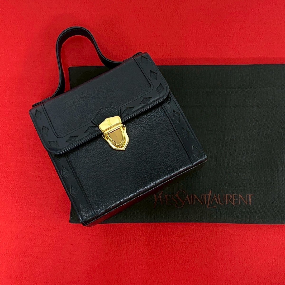 > ほぼ未使用 YVES SAINT LAURENT イヴ サンローラン ヴィンテージ YSL ロゴ金具 カットアウト レザー 本革 ハンドバッグ ブラック 47583