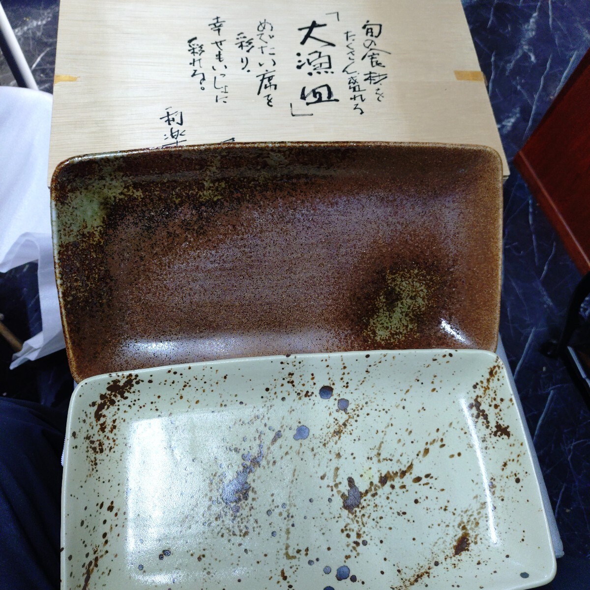 - 長角大皿2枚 利楽 大漁皿 34.5×19×3.3cm 木箱入
