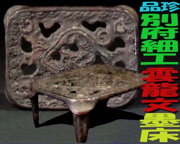 > ★☆本物保証★蜜蝋鋳物.別府細工・上手★ 墨床.墨置 ★雲に三っ爪龍.透し彫精密細工★精密仕上、良品★合せ箱・題は二人静☆★