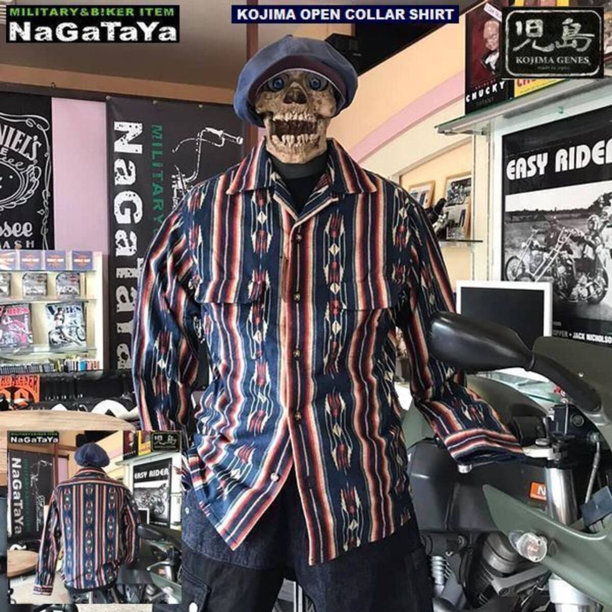- 児島ジーンズ KOJIMA GENES アズテック柄 プリント オープンカラー ネルシャツ RNB2014 ネイビー 紺 XLサイズ 日本製 MADE IN JAPAN