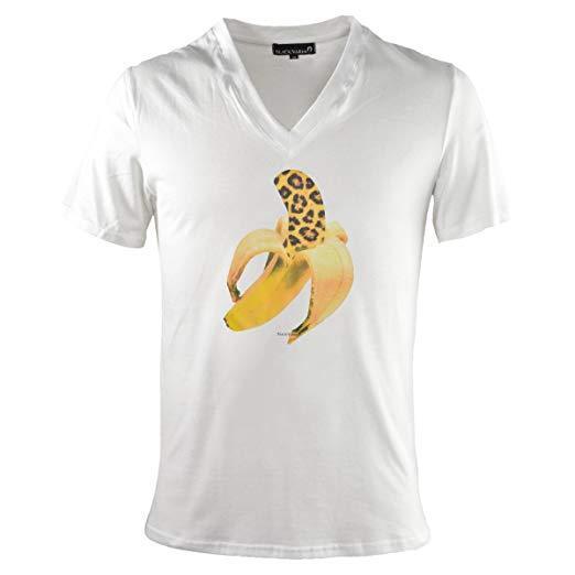 > zkk038-wh BLACK VARIA バナナ×ヒョウ豹柄 綿100% 半袖 Vネック Tシャツ メンズ(ホワイト白) XL プリント 細身 VT VTシャツ メール便可