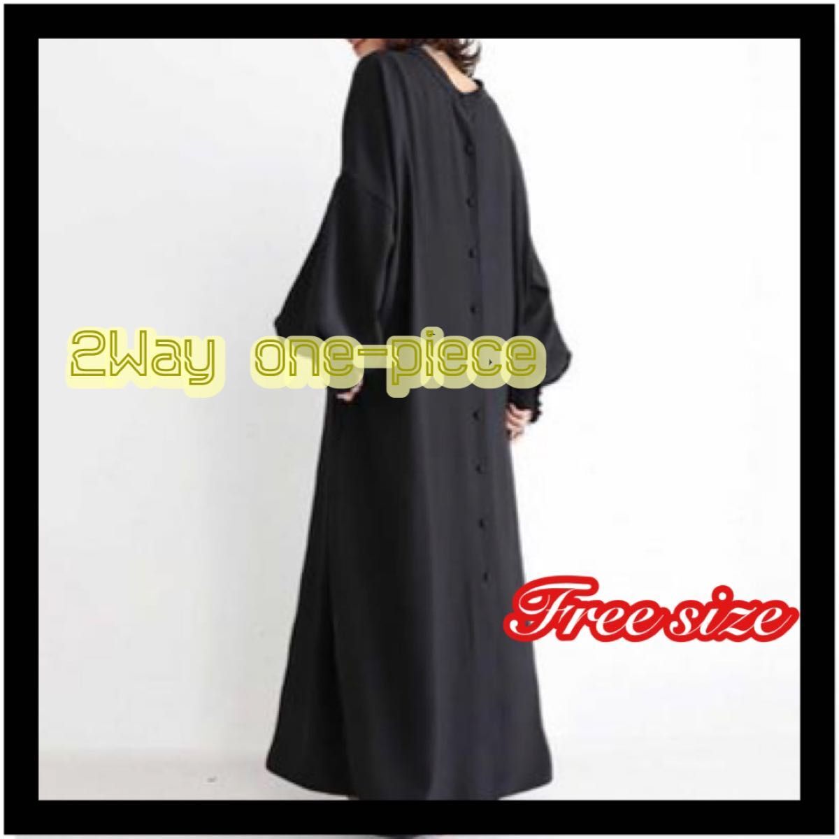 - 2Way ロング シャツワンピース マキシ丈 モード系 おしゃれ 演奏会 可愛い 長袖ワンピース ブラック 黒