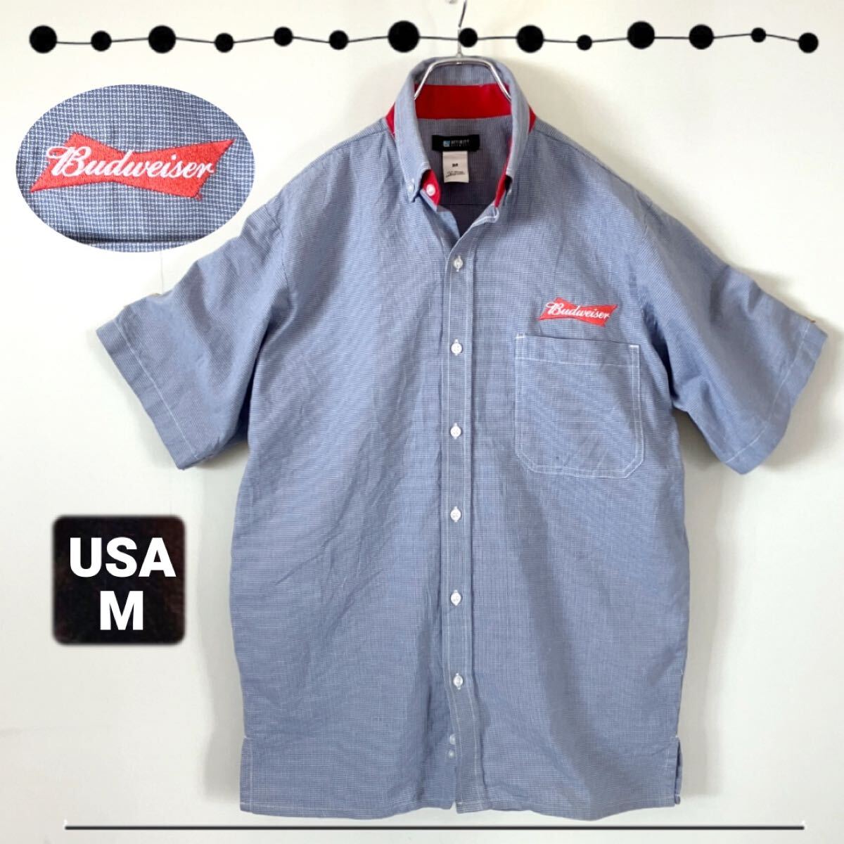 > バドワイザー Budweiser★格子織S/Sワークシャツ★刺繍ロゴ★ボタンダウンカラー★USAメンズM/JPNメンズL
